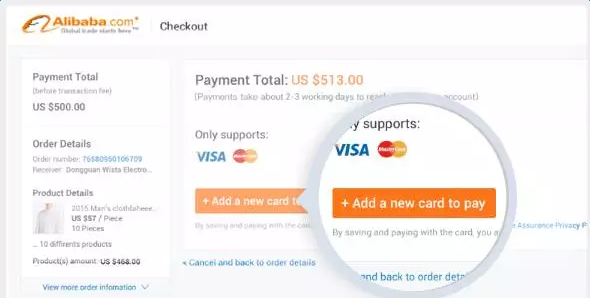 1000美金及以下訂單,僅支持信用卡支付方式。首次支付買家需添加付款賬戶、設(shè)置支付密碼,可通過郵箱或手機(jī)號碼設(shè)置支付密碼,后續(xù)付款直接輸入支付密碼即可。